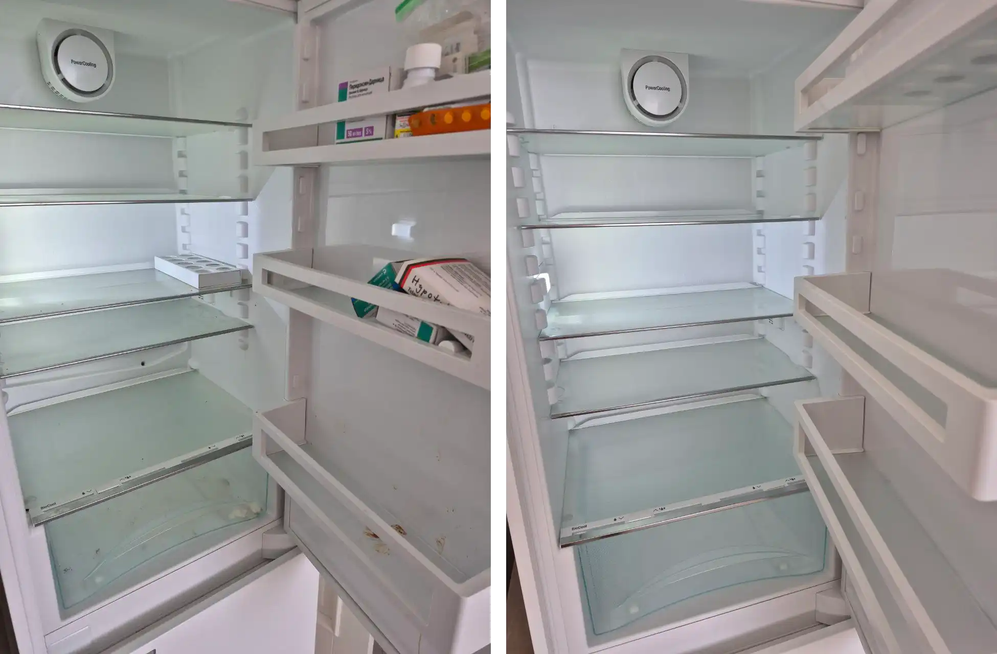 Це основний етап. Ми послідовно миємо всі приміщення, рухаючись зверху вниз, щоб забруднена вода не потрапляла на вже вимиті ділянки. Миємо стелі, стіни, двері, вимикачі, підвіконня, радіатори опалення. Далі ми ретельно миємо всі меблі зсередини та ззовні, знімаючи накопичений жир, пил та бруд. Особливу увагу приділяємо кухні та санвузлам: миємо плиту, витяжку, холодильник, микроволновку, сантехніку, кахель, видаляючи навіть найстаріші забруднення.